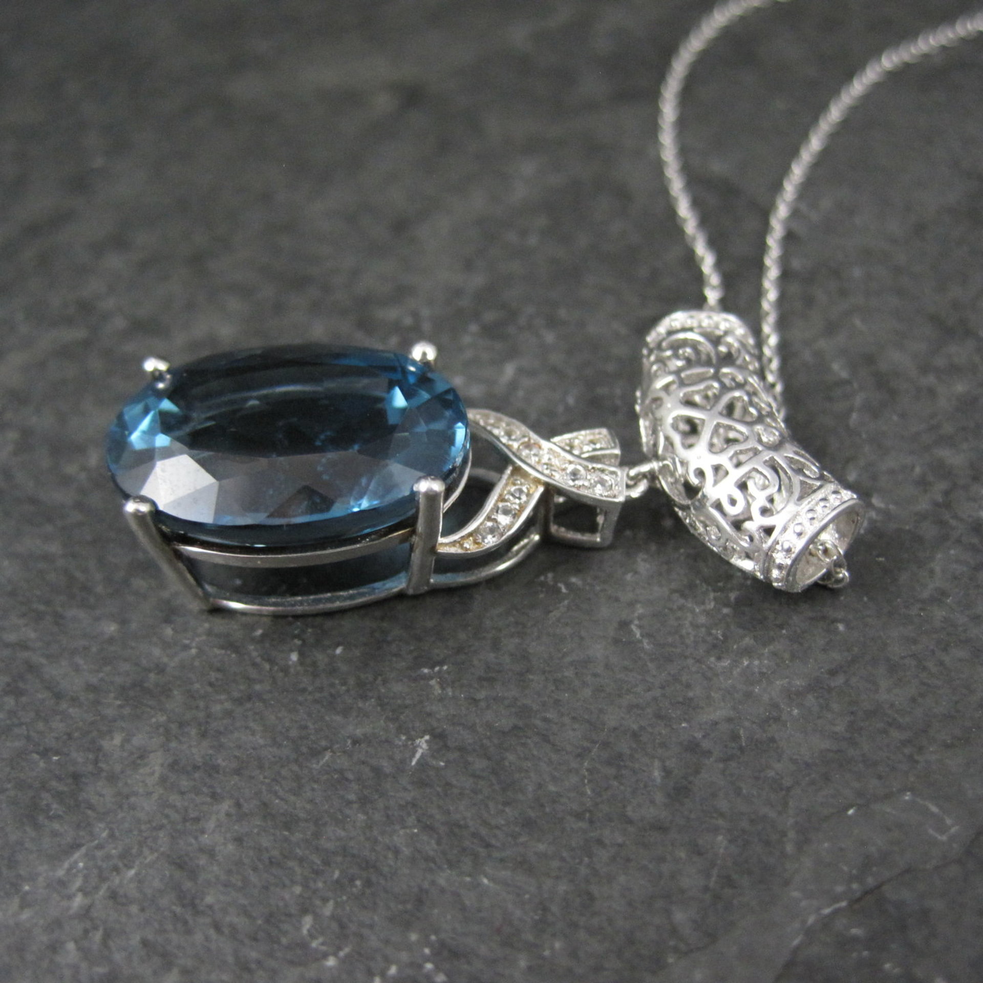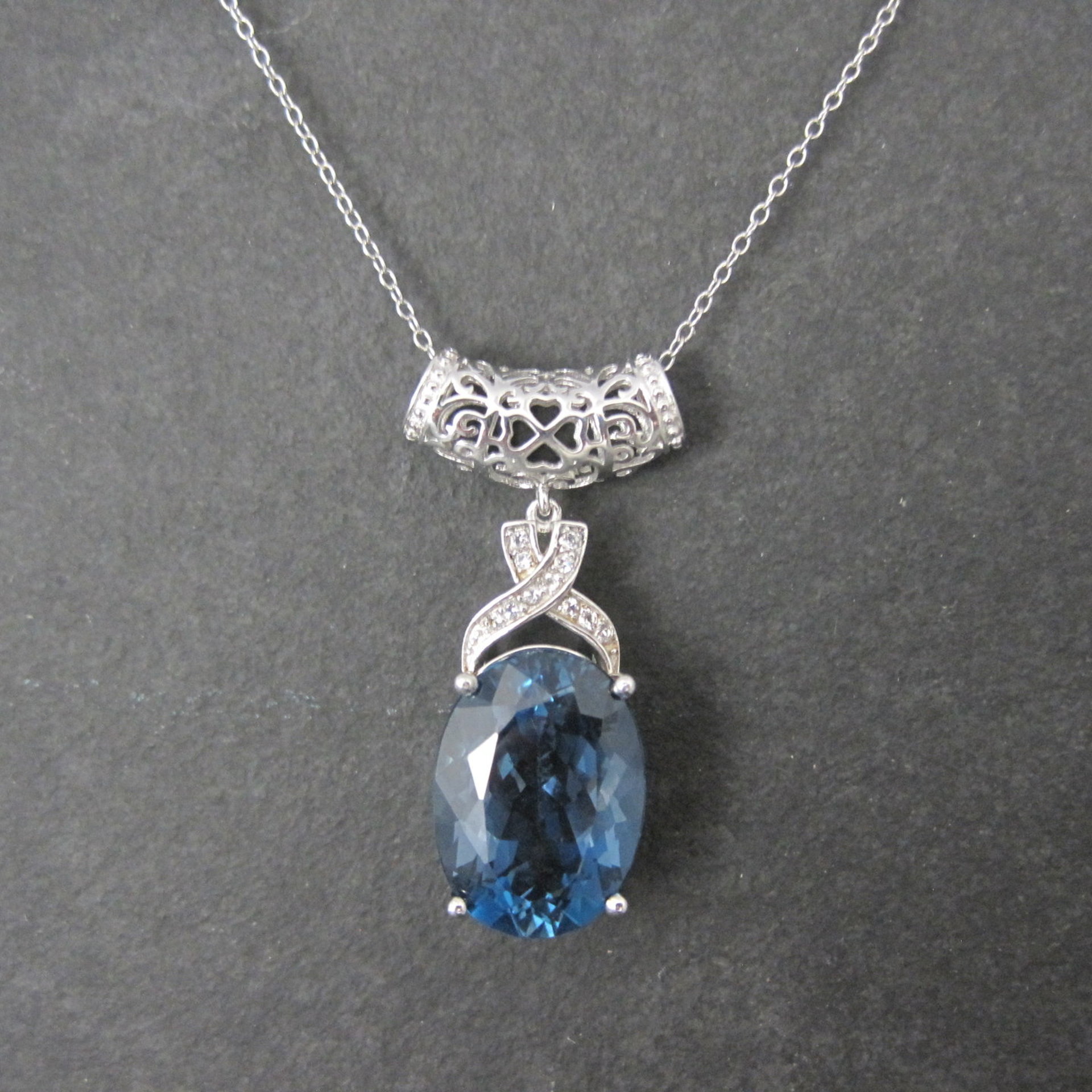 This beautiful pendant is sterling silver. It features a 16 carat, 13x18mm London blue topaz accented by white topaz gemstones.