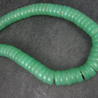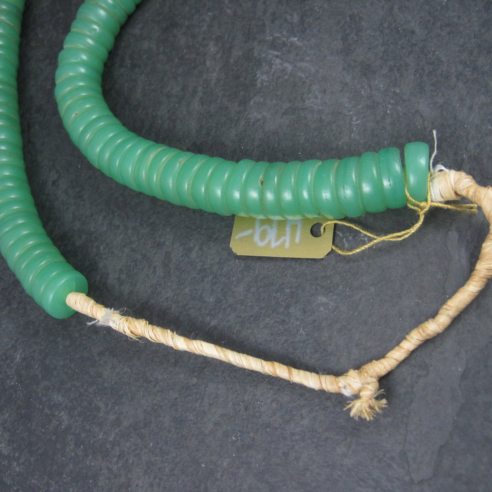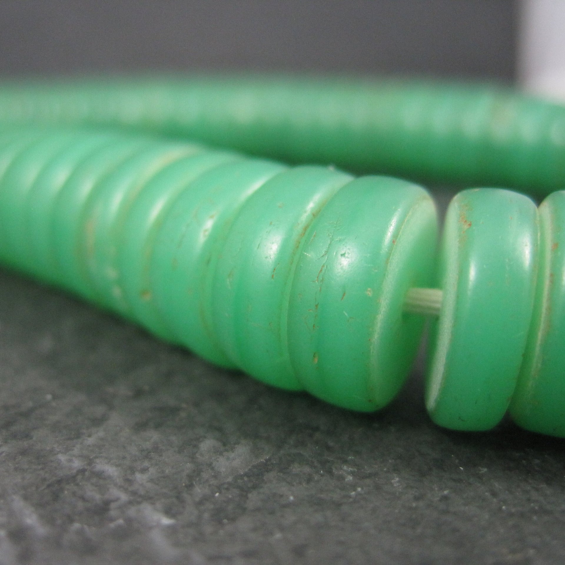 This gorgeous antique trade bead necklace consists of stunning green glass donut beads.