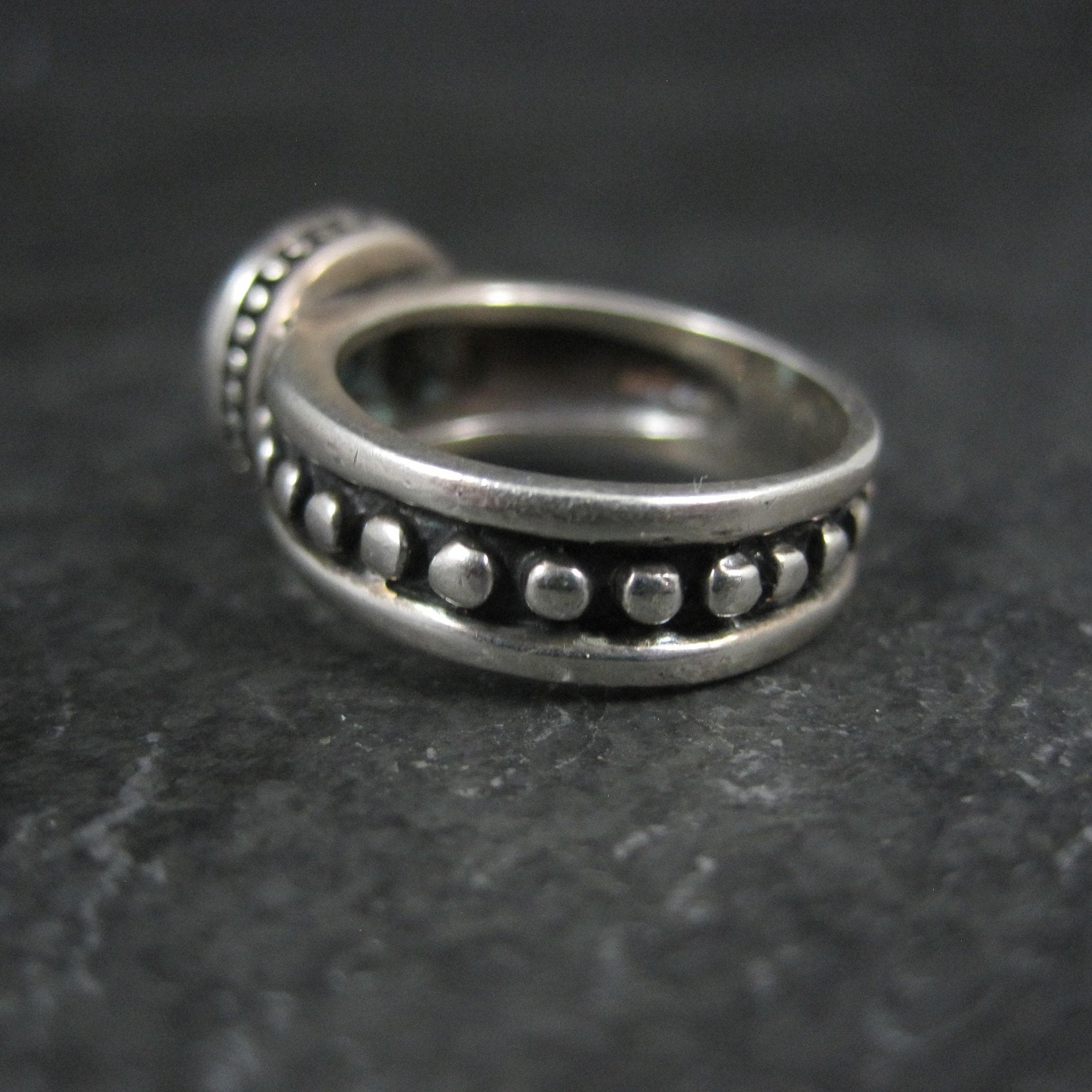 This beautiful estate ring is sterling silver.
