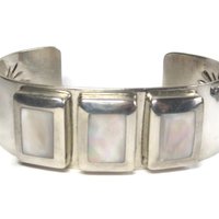 This gorgeous mother of pearl cuff bracelet is solid sterling silver.