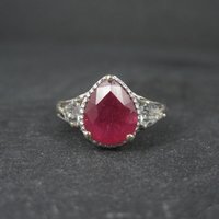 It features an 8x10mm pear cut ruby accented by 4mm white topaz gemstones.
