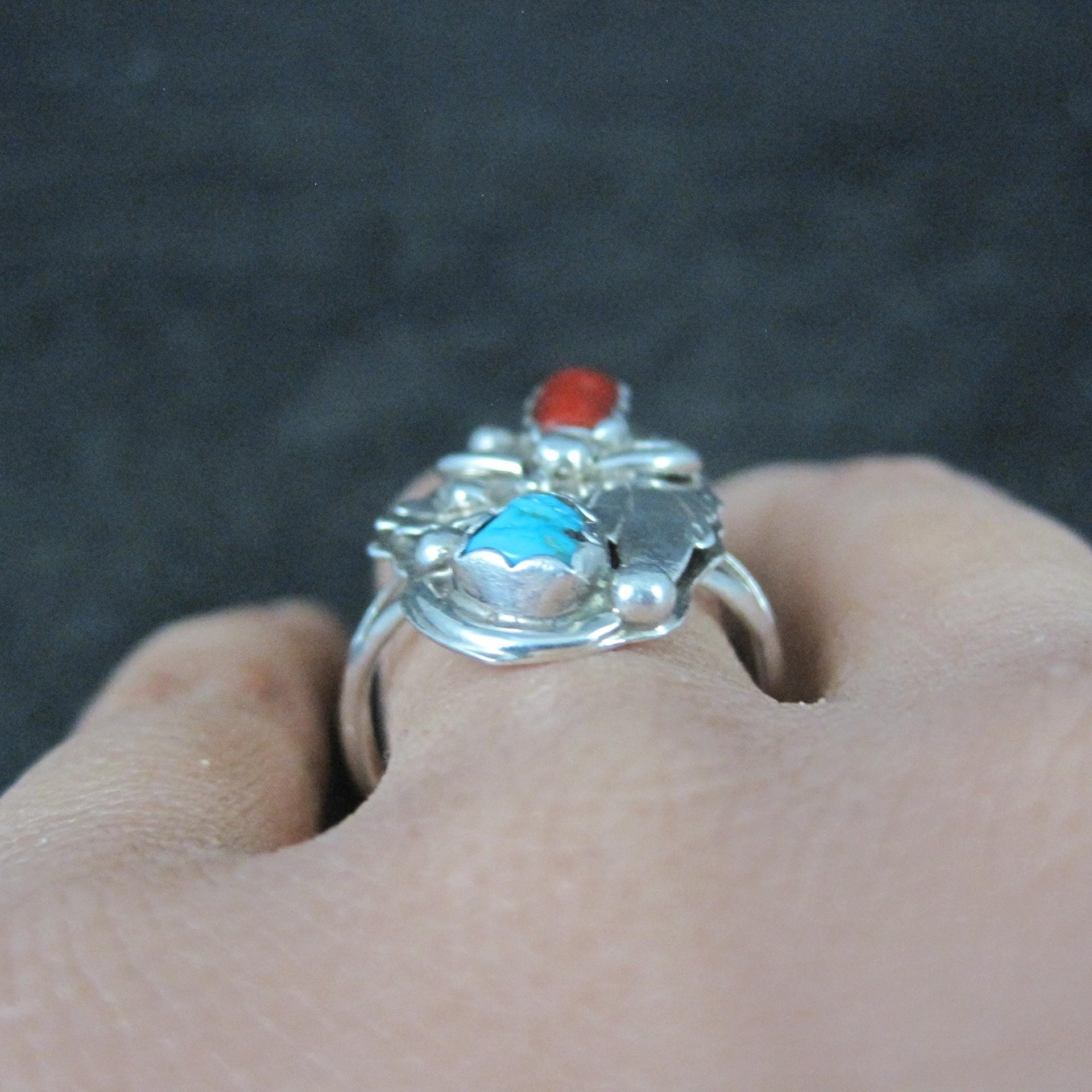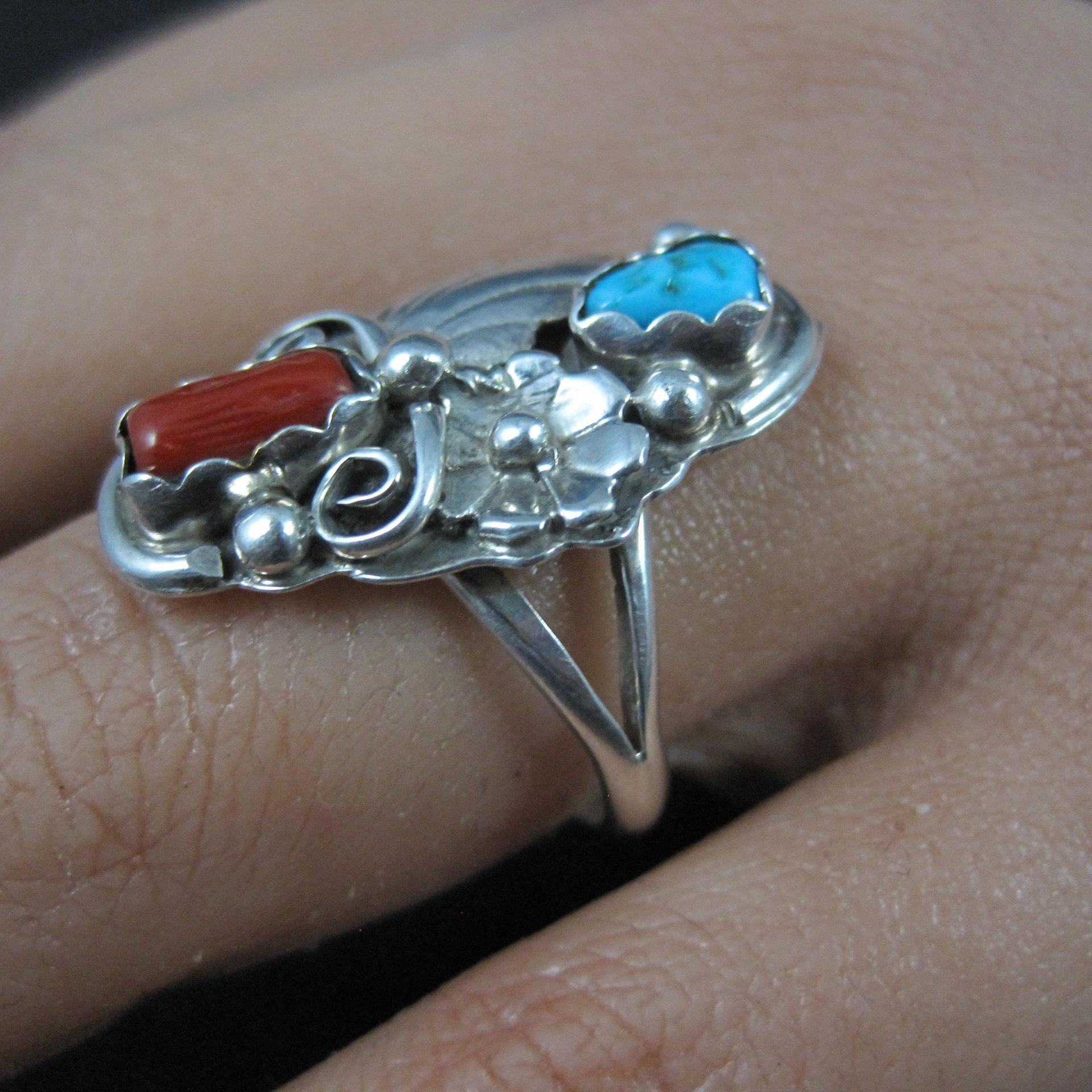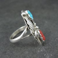 This beautiful Southwestern ring is sterling silver with natural turquoise and coral gemstones.