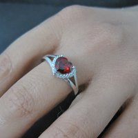 It features a 7mm heart cut garnet surrounded by round cubic zirconias.
