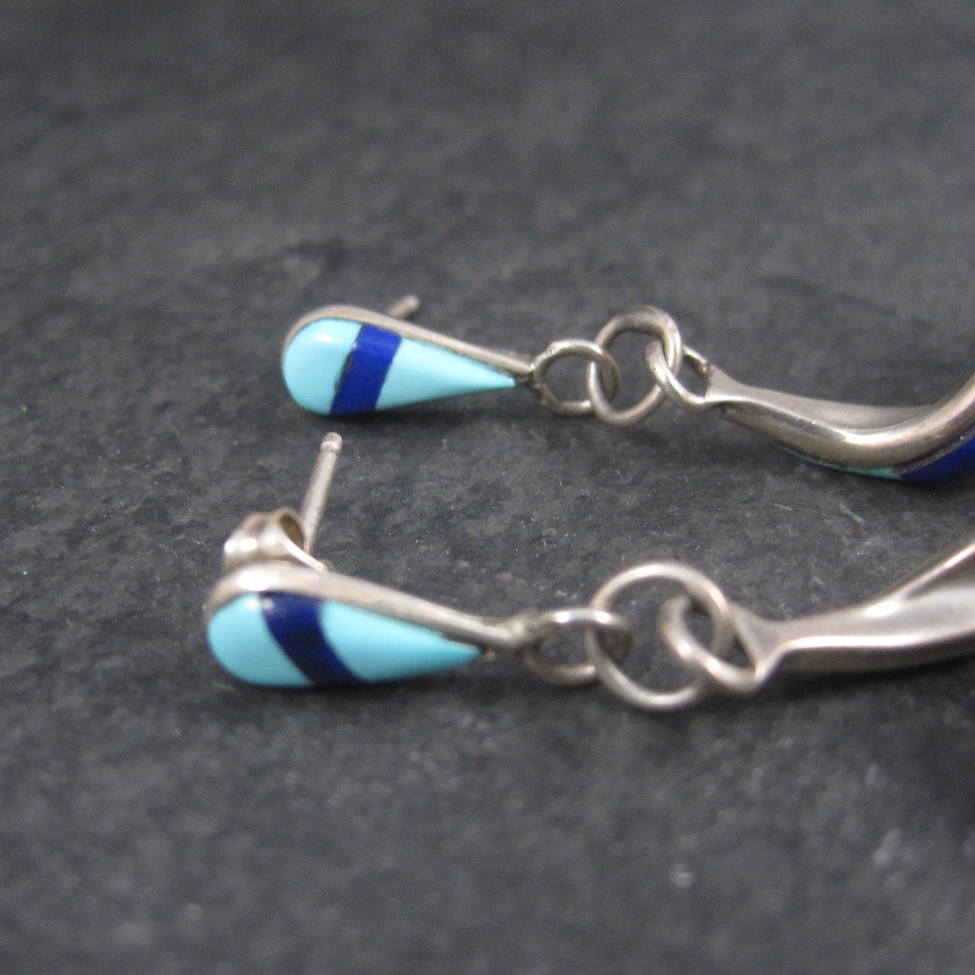 These gorgeous Southwestern earrings are sterling silver with turquoise, lapis, mother of pearl and coral inlay.