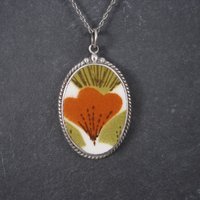 Vintage Sterling 70s Floral Pottery Pendant Necklace