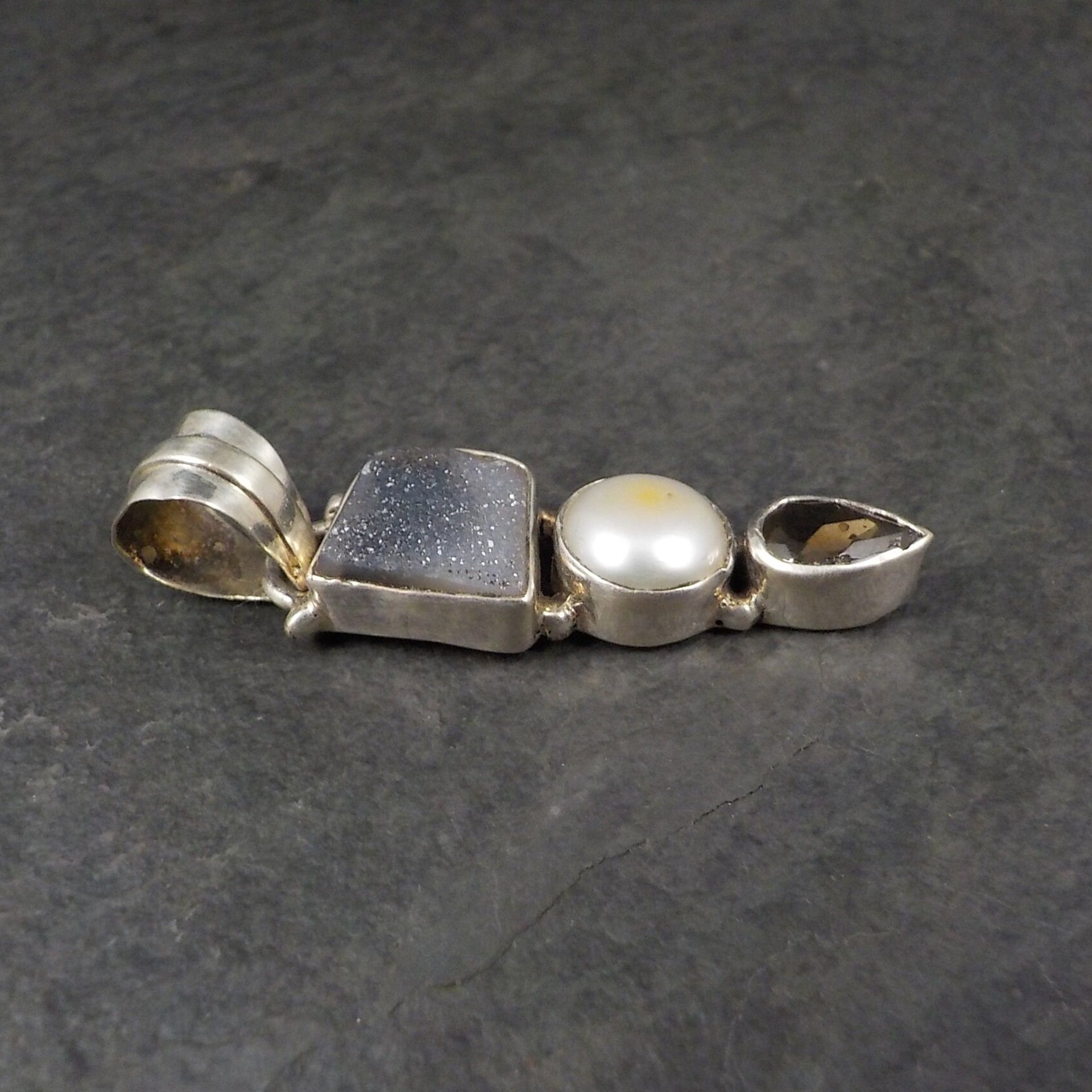 It features a druzy stone, pearl and either a smoky quartz or topaz stone.